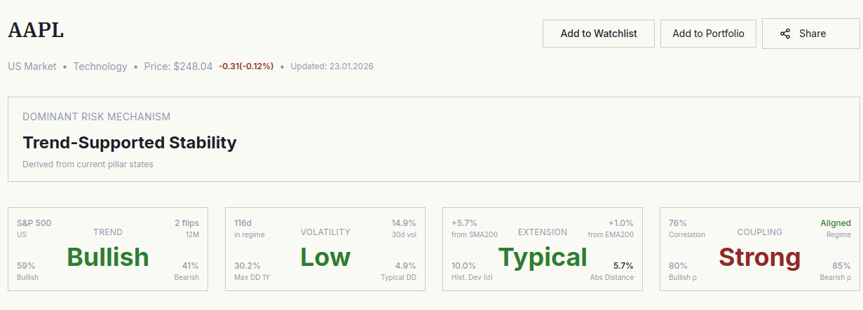 Is this asset extended, volatile, or tightly coupled to the market — relative to its own history?